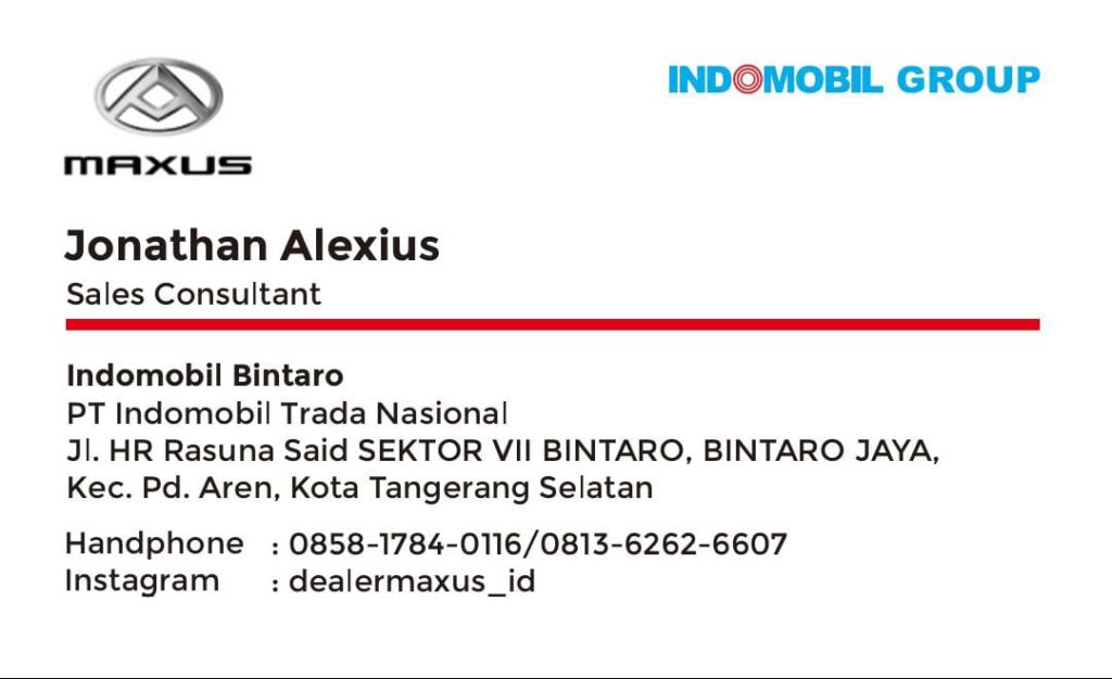 Sebagai Dealer Maxus Resmi Jakarta, Anda akan mendapatkan pengalaman pembelian mobil yang mudah, aman, dan menyenangkan. Saya siap membantu Anda menemukan mobil Maxus terbaik sesuai kebutuhan, memberikan informasi lengkap, simulasi kredit yang transparan, serta promo resmi langsung dari Maxus Indonesia. Konsultasikan kebutuhan Anda hari ini, dan rasakan pelayanan profesional dari sales resmi yang siap mendampingi Anda hingga mobil impian tiba di tangan Anda.